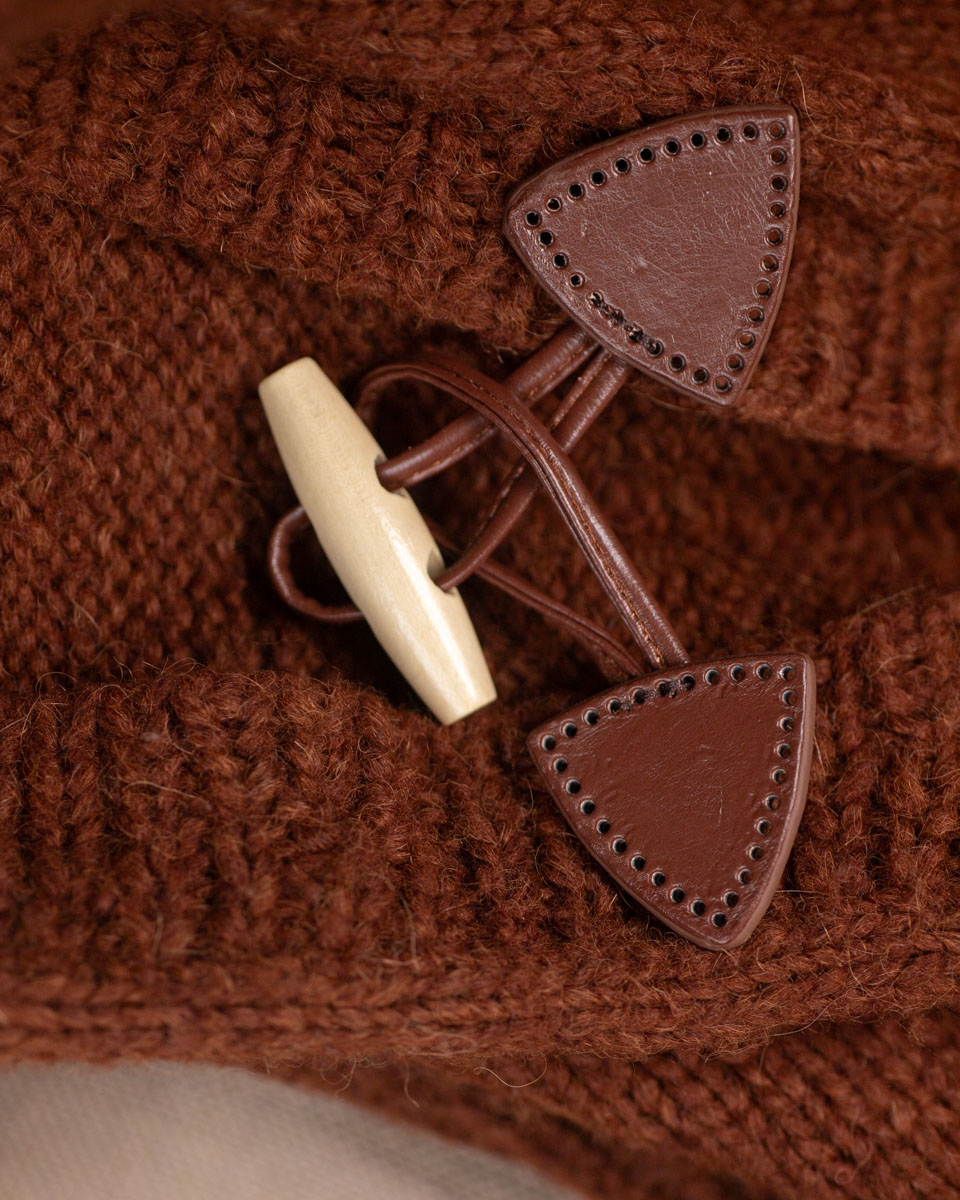 Prym Duffelspänne blir ursnyggt till stickat. Kanske som ett enkelt spänne med klassisk look, som håller ihop koftan eller sjalen? Knappen är i trä, och detaljerna i konstläder. Längs kanten finns hål, som gör spännet enkelt att sy på. Kan handtvättas i svalt vatten. Mått: 15 x 5 cm.