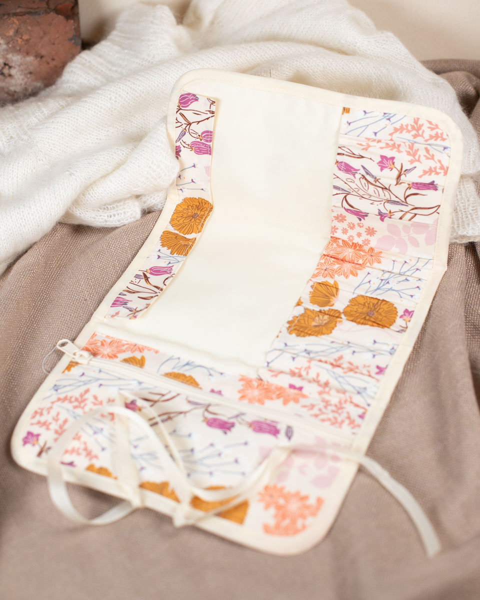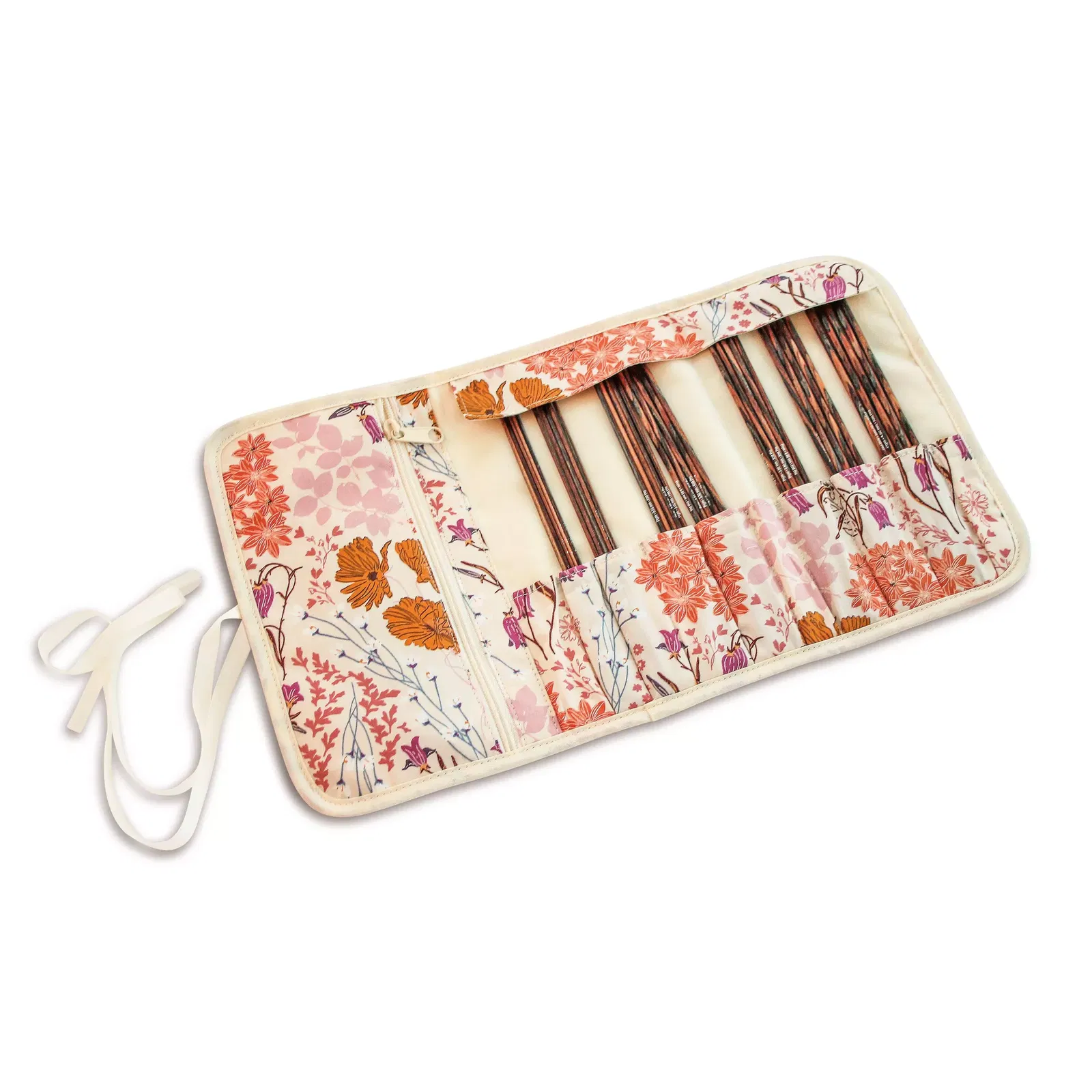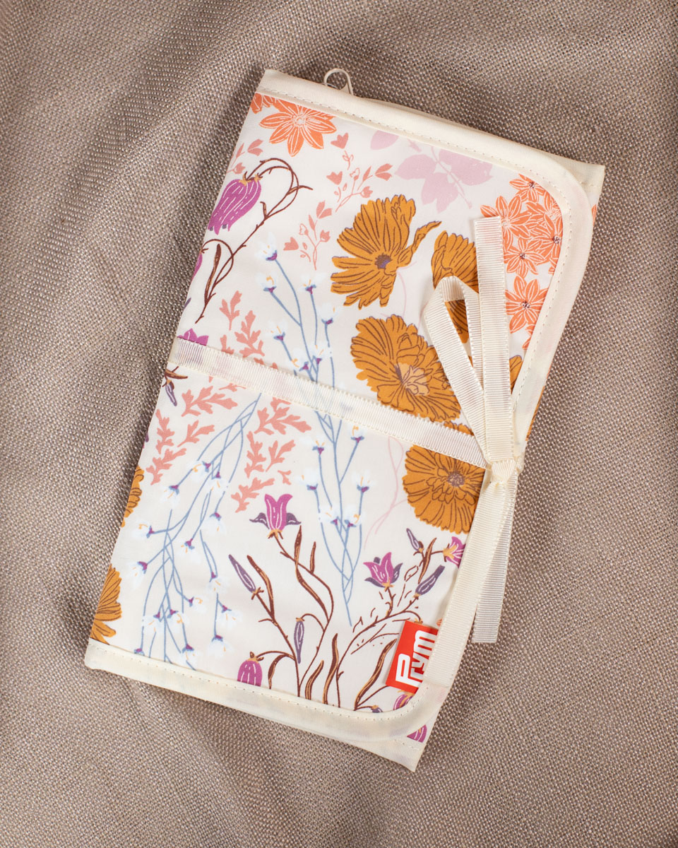 Prym Fodral till Strumpstickor är ett mjukt tygfodral som viks eller rullas ihop till en praktisk storlek. Knyt bandet för att stänga. Inuti finns tio fack för strumpstickor eller virknålar, och i överkant finns en tygflik som ser till att stickorna inte glider ut. Facken har olika bredder mellan 2 – 3 cm. Det finns också ett litet fack med dragkedja till dina tillbehör. Mått vikt: 130 mm bredd x 230 mm höjd x 20 mm tjocklek.