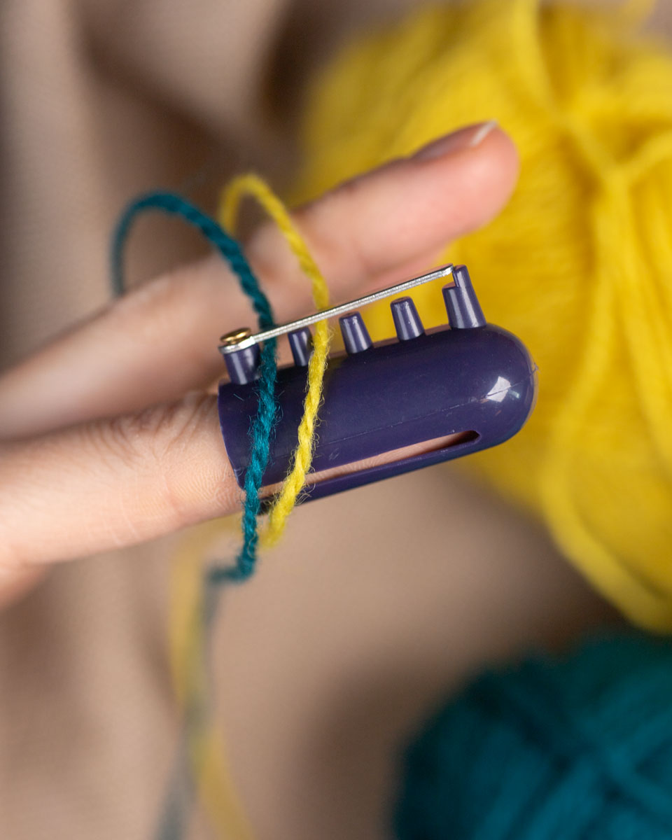 Prym Stickfingerborg är ett hjälpmedel för dig som stickar flerfärgsstickning. Trä trådarna genom separata kanaler, så blir det enklare att hålla (och hålla reda på) dem utan trassel. Fingerborgen har fyra kanaler för trådar. Skjut den lilla haspen åt sidan, och lägg trådarna på plats. Haspen gör det också enkelt att byta plats på trådarna medan du arbetar. Fingerborgen är i plast, och har en öppen skåra längs sidan som gör att den kan töjas lite i storlek. Fingerborgen mäter 11 mm i diameter. Är du osäker på storleken? Gör en liten ring av papper, och testa.
