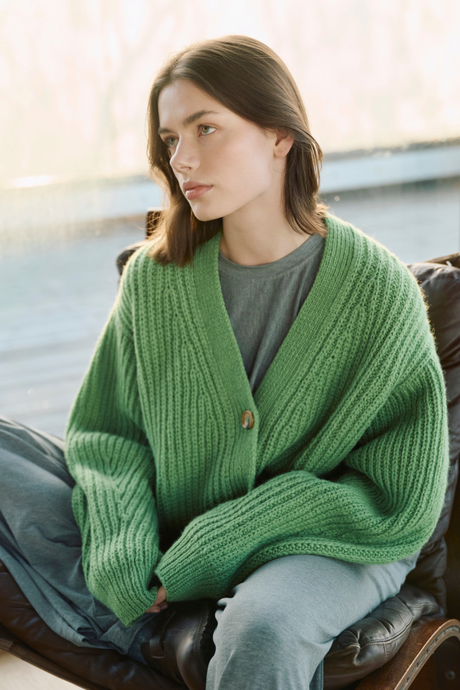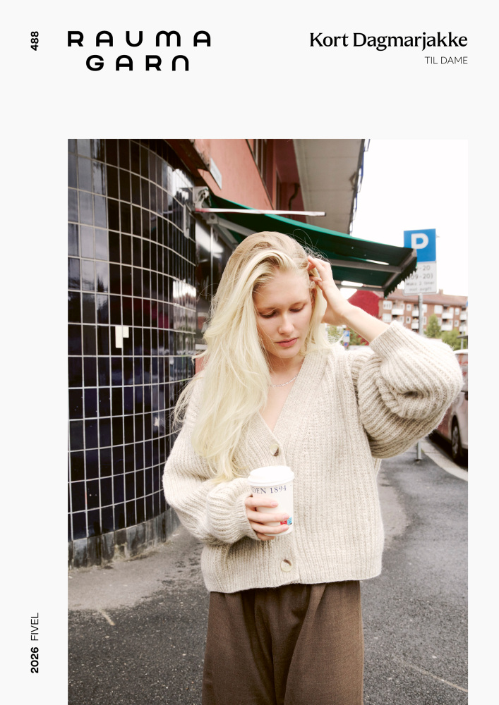 Det här är mönsterbladet Kort Dagmarjakke (488) från Rauma – en stilren kofta i halvpatent med v-ringning. Den stickas i garnet Lamull från Rauma.