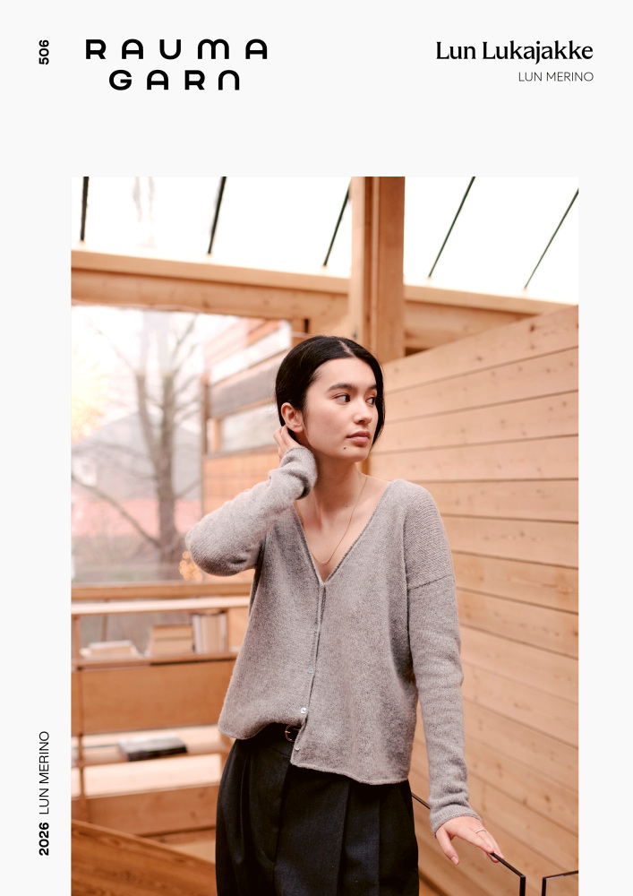 Det här är mönsterbladet Lun Lukajakke (506) från Rauma – en klassisk och lyxig kofta med v-ringning som stickas uppifrån och ner i det mjuka garnet Lun Merino från Rauma. Mönsterbladet är på svenska!