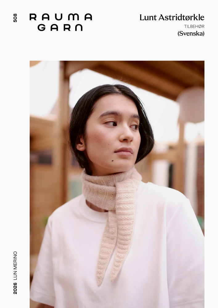 Det här är mönsterbladet Lunt Astridtørkle (508) från Rauma – en lång och smal scarf med snygg struktur i räta och aviga maskor. Scarfen stickas i det mjuka och lyxiga garnet Lun Merino från Rauma. Mönsterbladet är på svenska!