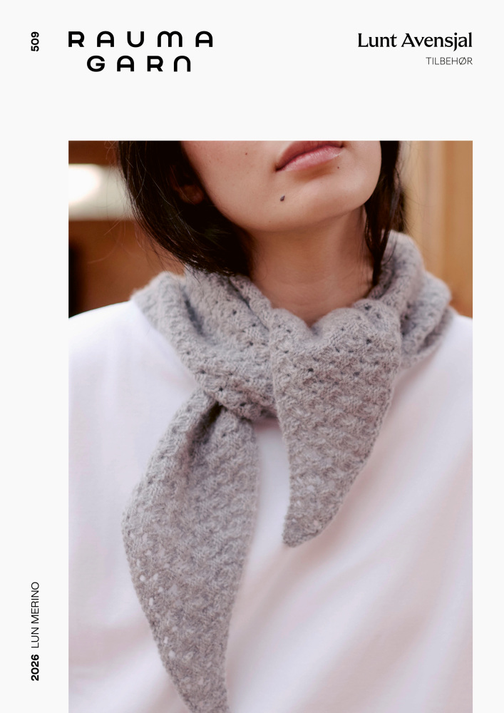 Det här är mönsterbladet Lunt Avensjal (509) från Rauma – en trekantsscarf med fokus på detaljer och struktur. Scarfen är lika snygg på fram- och baksidan, och både minskningar och ökningar smälter in i strukturmönstret. Scarfen stickas i det mjuka och lyxiga garnet Lun Merino från Rauma. Mönsterbladet är på svenska!