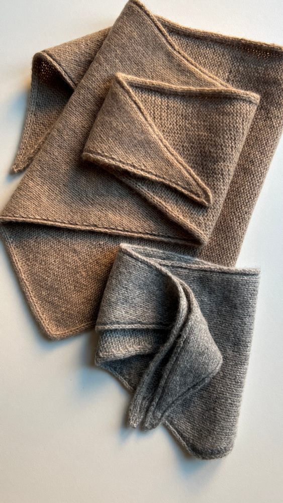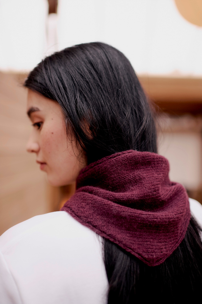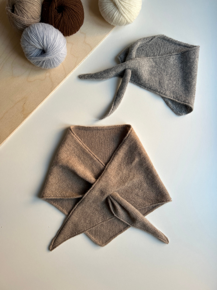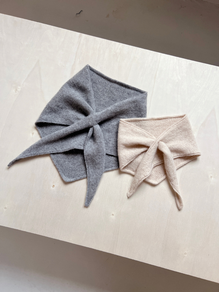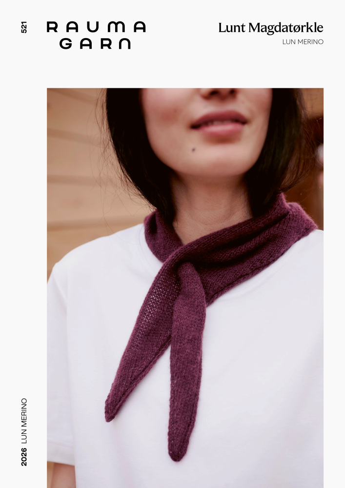 Det här är mönsterbladet Lunt Magdatørkle (521) från Rauma – en trekantsscarf som stängs med hjälp av ett karaktäristiskt hål. Det gör att scarfen ligger snyggt runt halsen utan att behöva knytas. Två olika storlekar av scarfen finns med i mönstret, som stickas i det mjuka och lyxiga garnet Lun Merino från Rauma