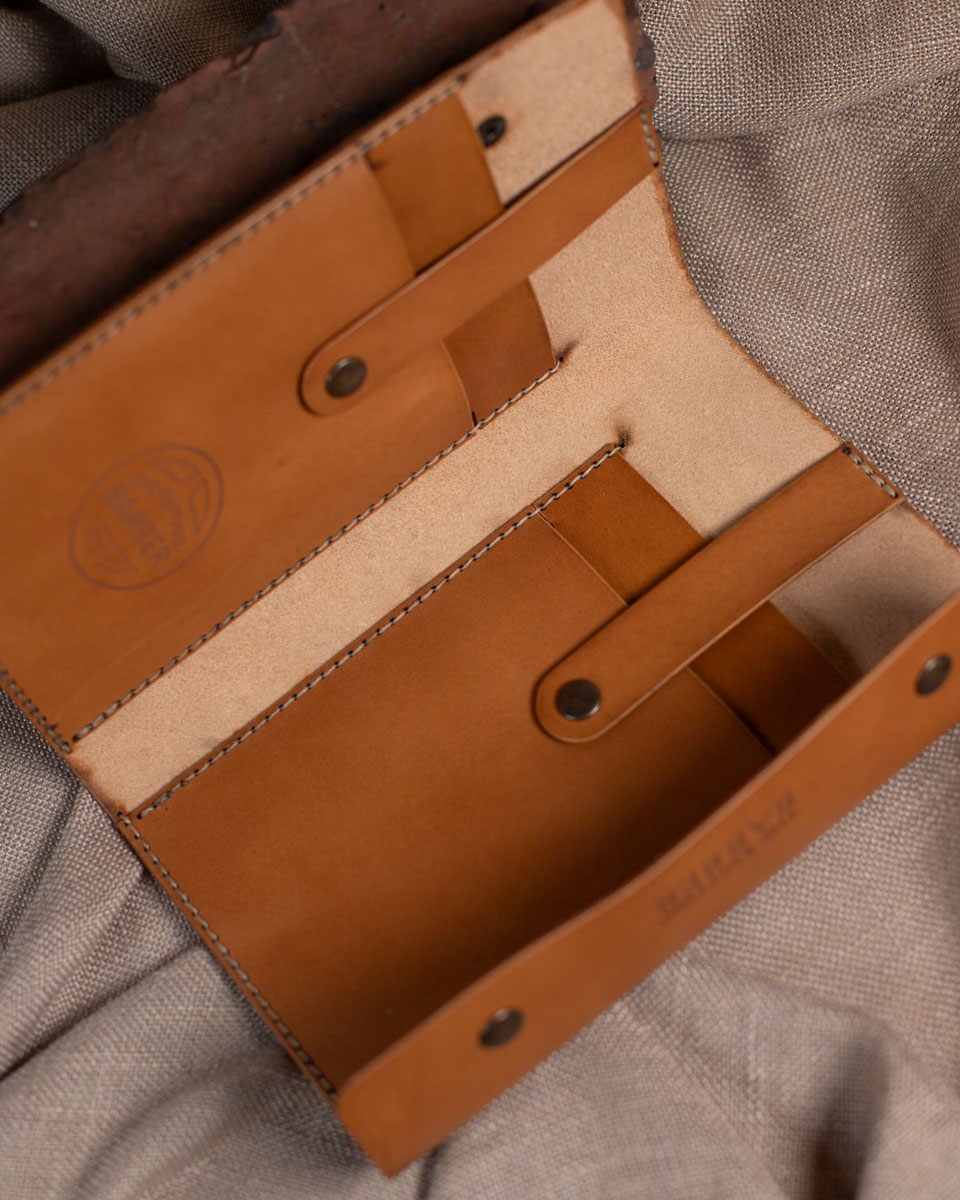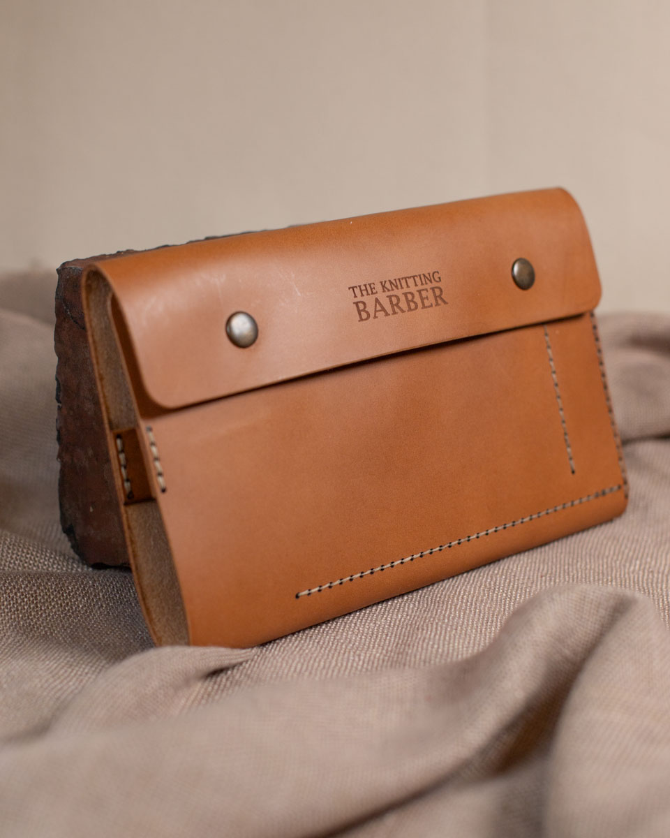 Fodral till rundstickor från The Knitting Barber är handgjort i äkta läder av hög kvalitet. Ett snyggt fodral med fyra fack, som rymmer minst 12 rundstickor beroende på deras storlek. Fodralets fack är placerade två och två. Remmen med knäppen håller stickorna på plats under transport. Fodralet har lasergraverad logo och två knäppen. Det glassigaste resefodralet?